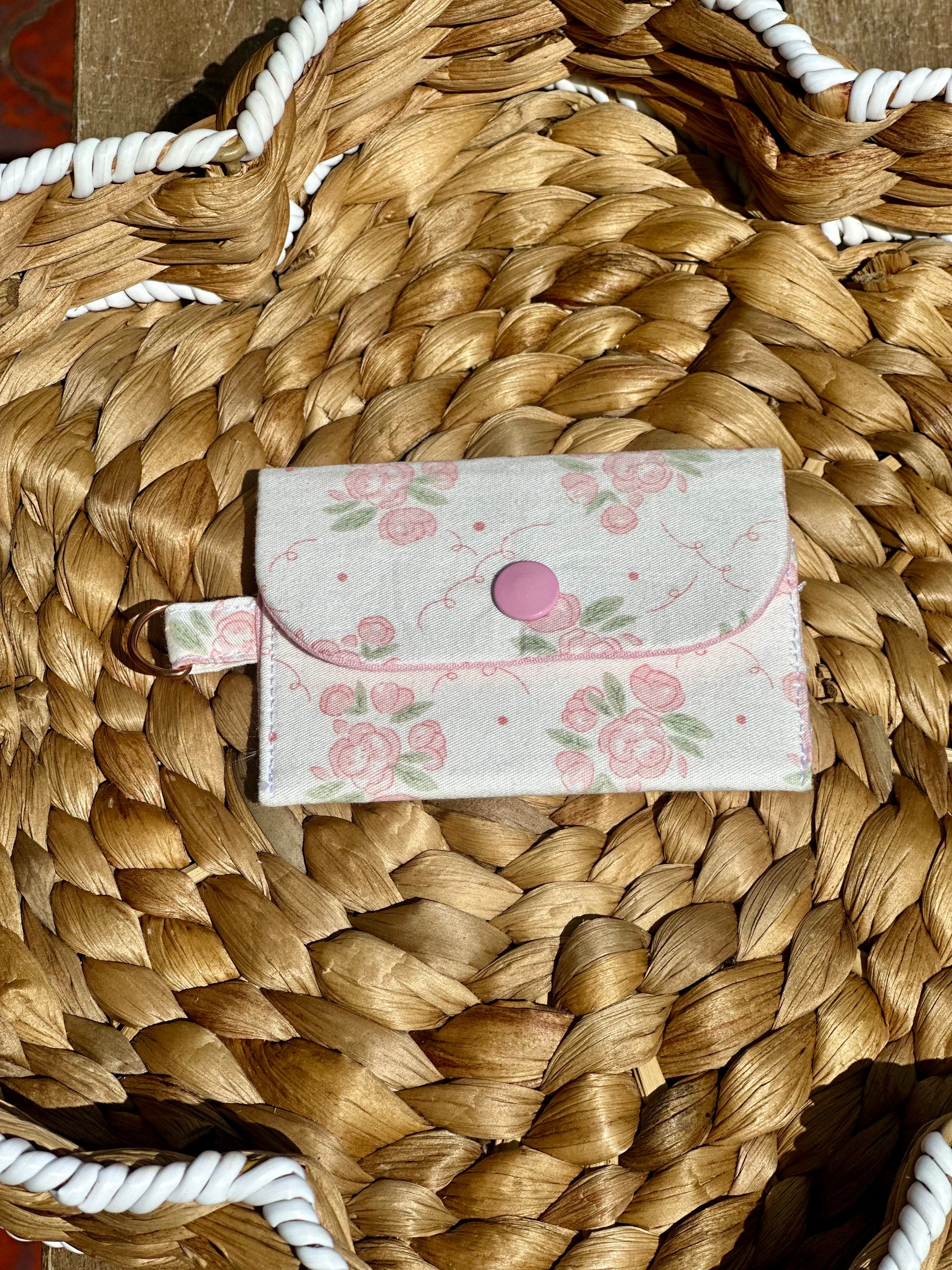 Pretty sweet Pink Fauna card case. Made in 100% cotton fabric. Attached with metal ring for wristlet or key chain (excluded).
